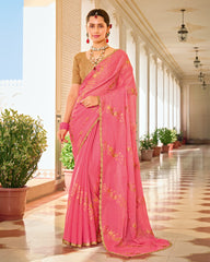 Warm Pink Designer Chiffon-Georgette Saree With Zari-Embroidery-Diamond Work And Cut Work Border