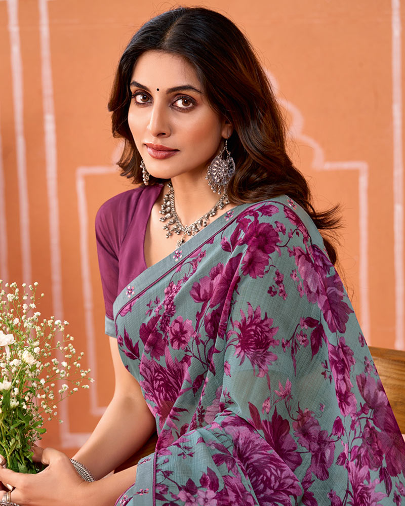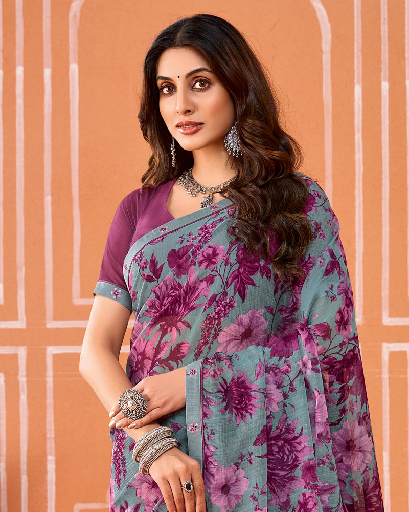 Vishal Prints Bluish Grey And Dark Mauve Printed Fancy Chiffon Saree With Fancy Border