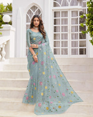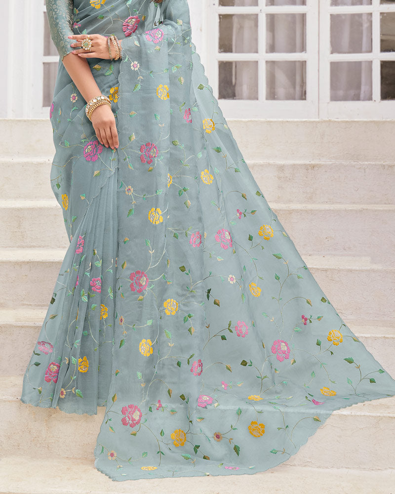 Vishal Prints Cool Grey Designer Tissue Organza Saree With Embroidery-Diamond Work And Cut Work Border