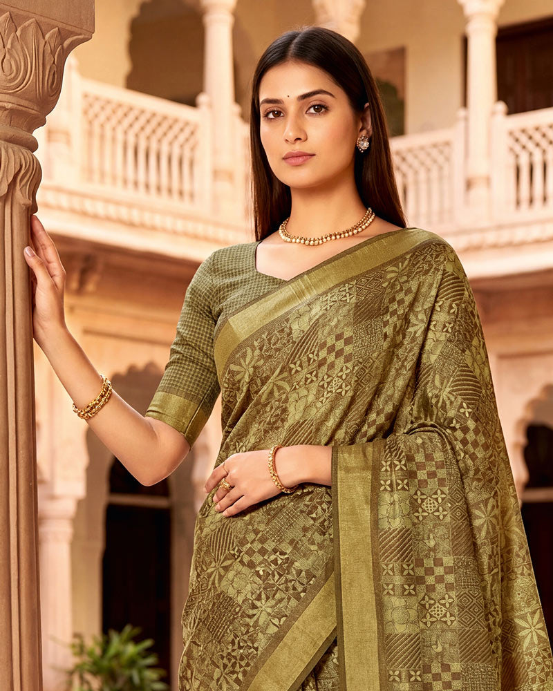 Vishal Prints Greenish Beige Printed Shimmer Moss Digital Print Saree With Weaved Viscose Patta