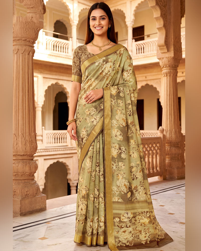 Vishal Prints Greenish Beige Printed Shimmer Moss Digital Print Saree With Weaved Viscose Patta