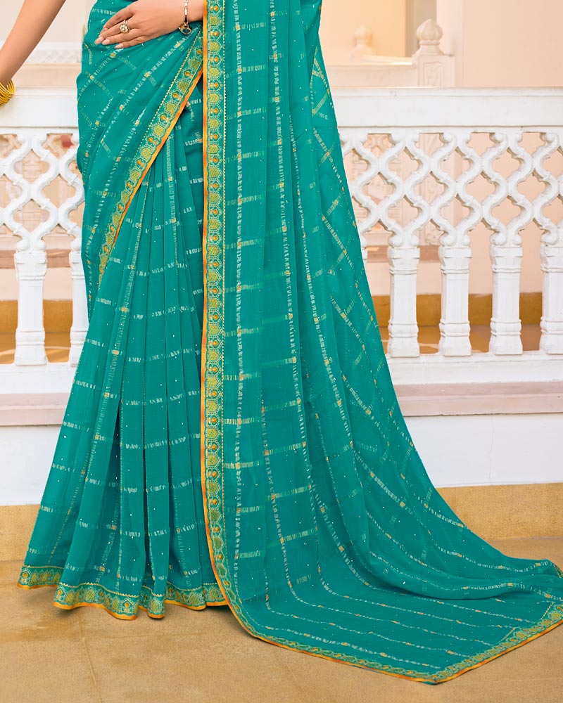 Vishal Prints Persian Green Designer Fancy Checks Chiffon Saree With Diamond Work And Embroidery Border