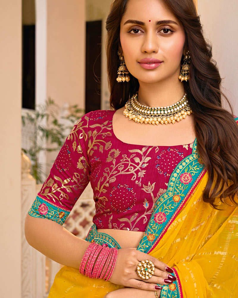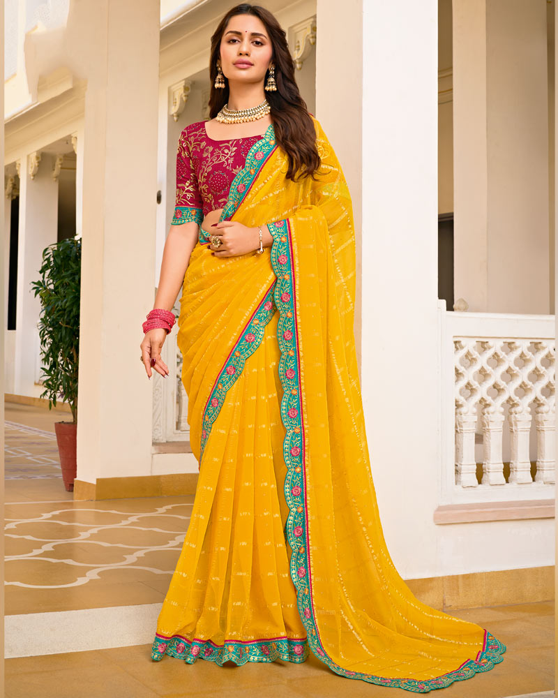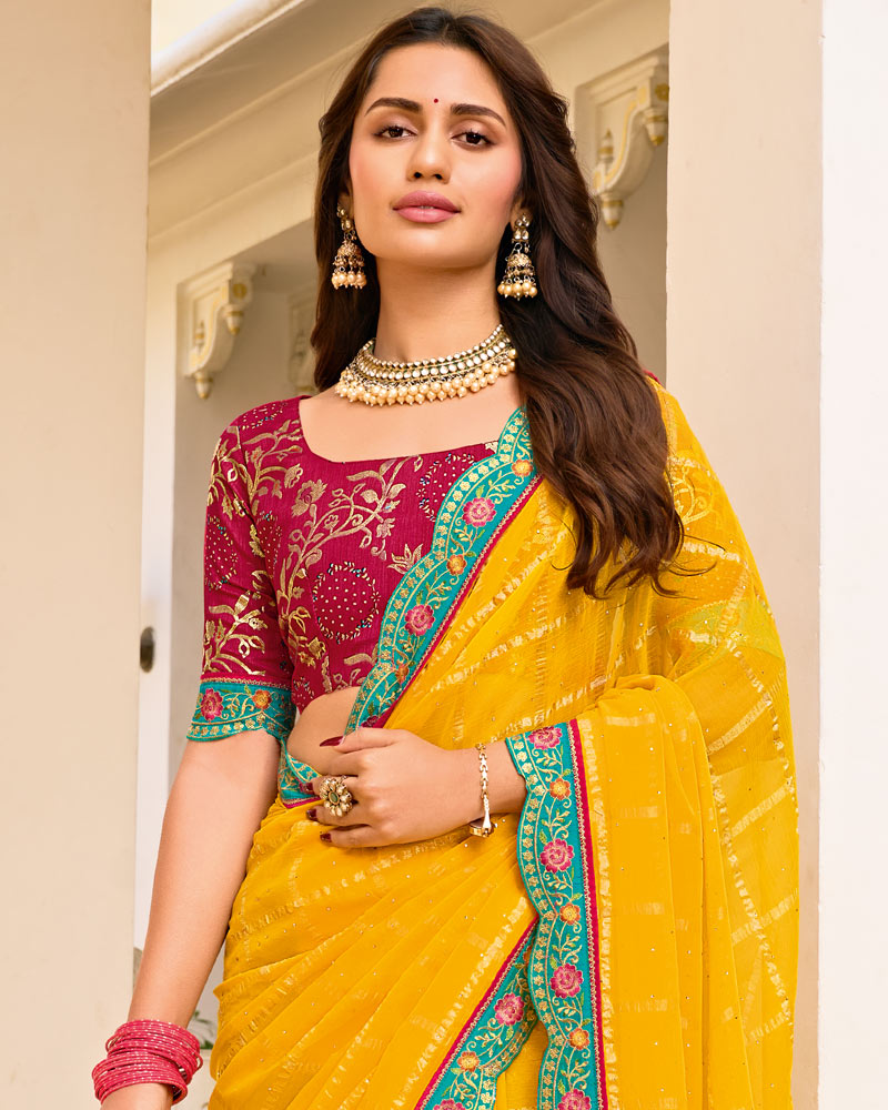 Vishal Prints Yellow Orange Designer Fancy Checks Chiffon Saree With Diamond Work And Embroidery Border