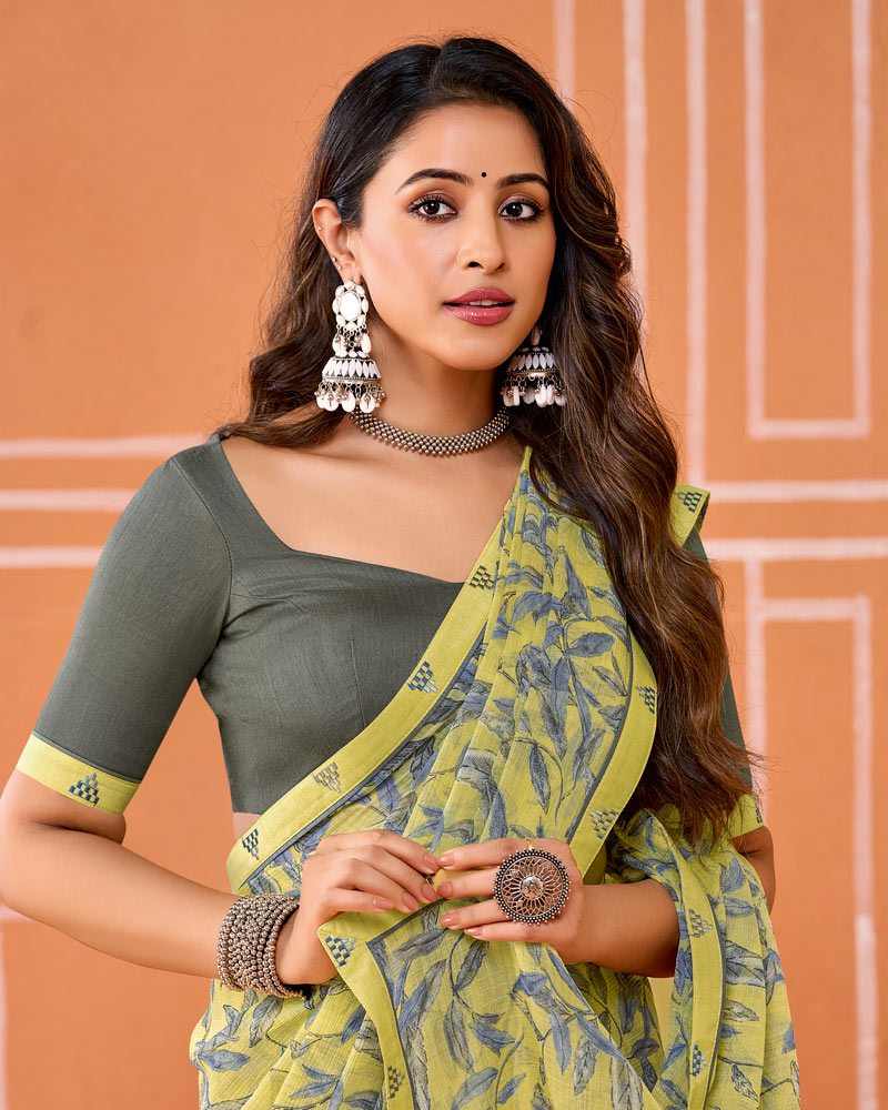 Vishal Prints Yellowish Green Printed Fancy Chiffon Saree With Fancy Border