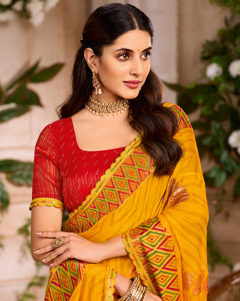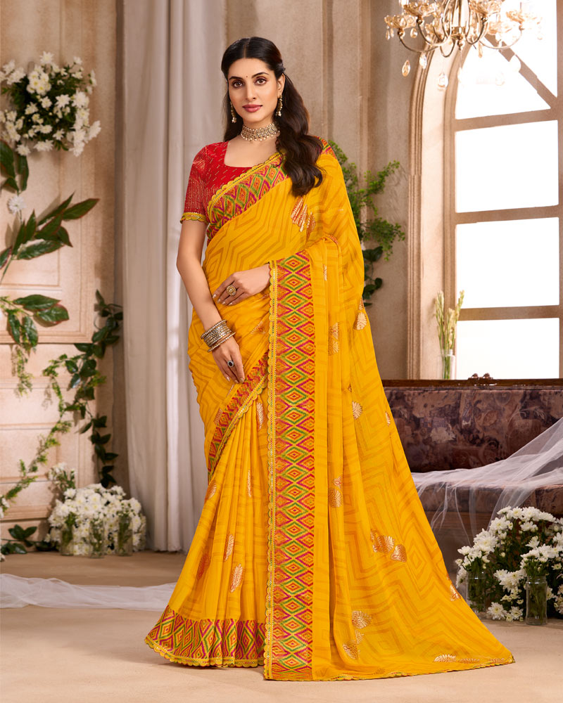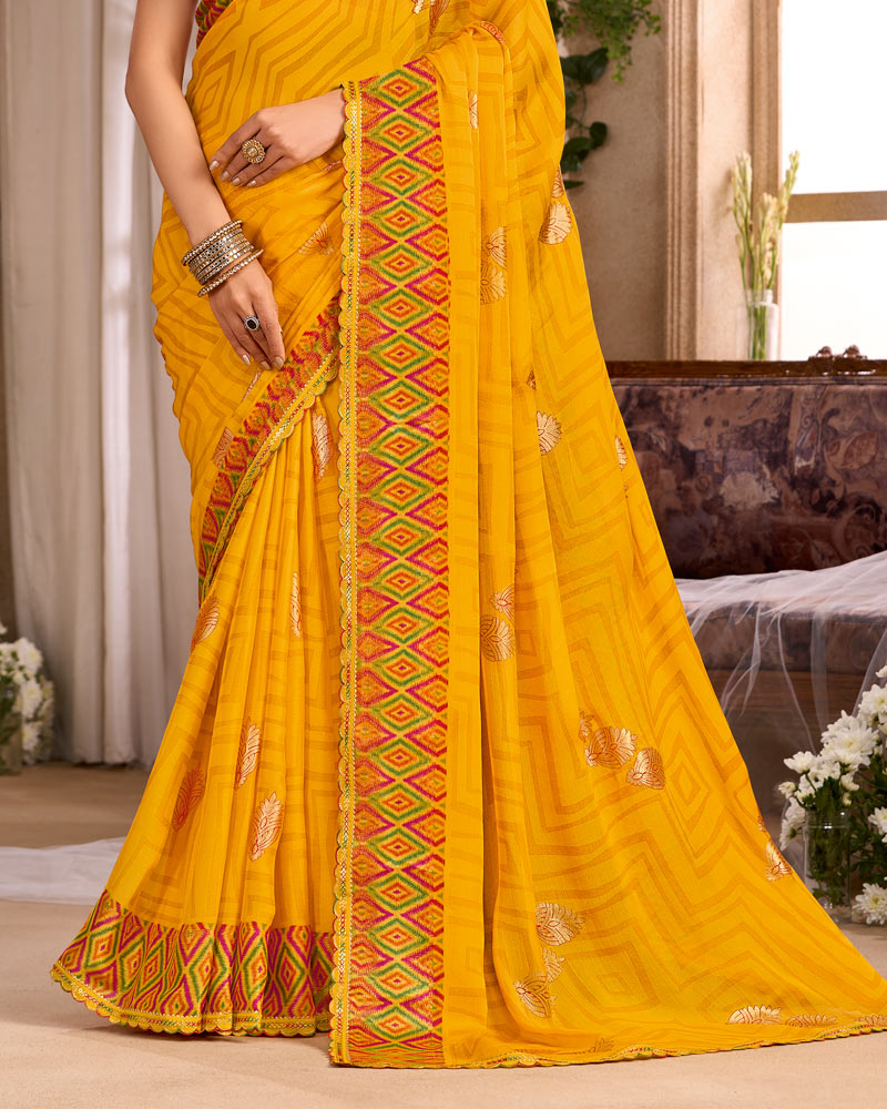 Vishal Prints Golden Yellow Printed Chiffon Saree With Foil Print And Cut Work Embroidery Border