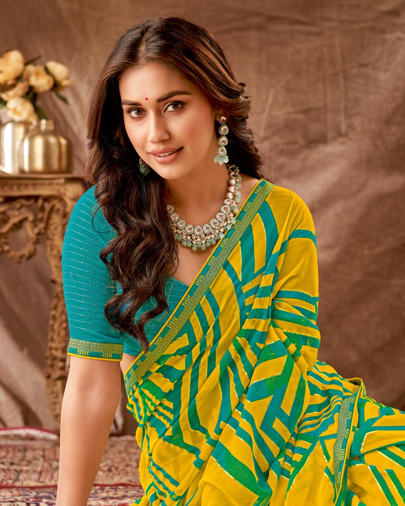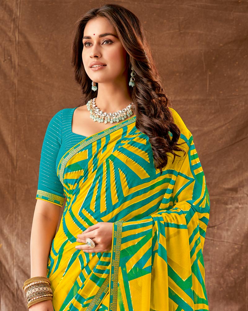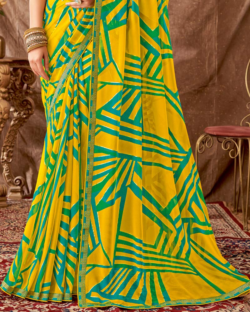 Vishal Prints Golden Yellow Printed Georgette Saree With Foil Print And Fancy Border