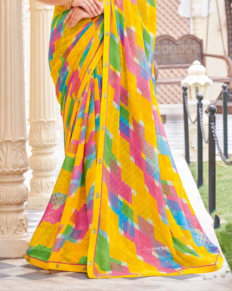 Vishal Prints Golden Yellow Printed Patterned Georgette Saree With Fancy Border