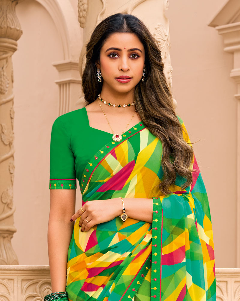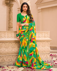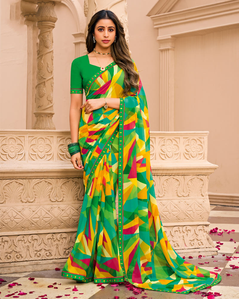 Vishal Prints Leaf Green Printed Georgette Saree With Fancy Border