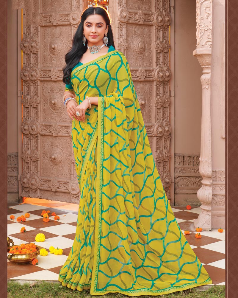 Vishal Prints Mustard Yellow Printed Georgette Saree With Fancy Border