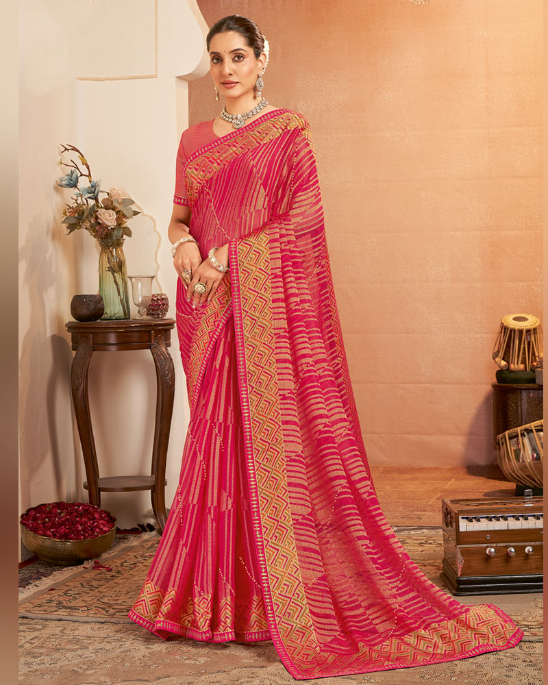 Vishal Prints Rani Pink Printed Brasso Saree With Diamond Work And Fancy Border