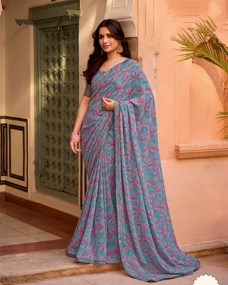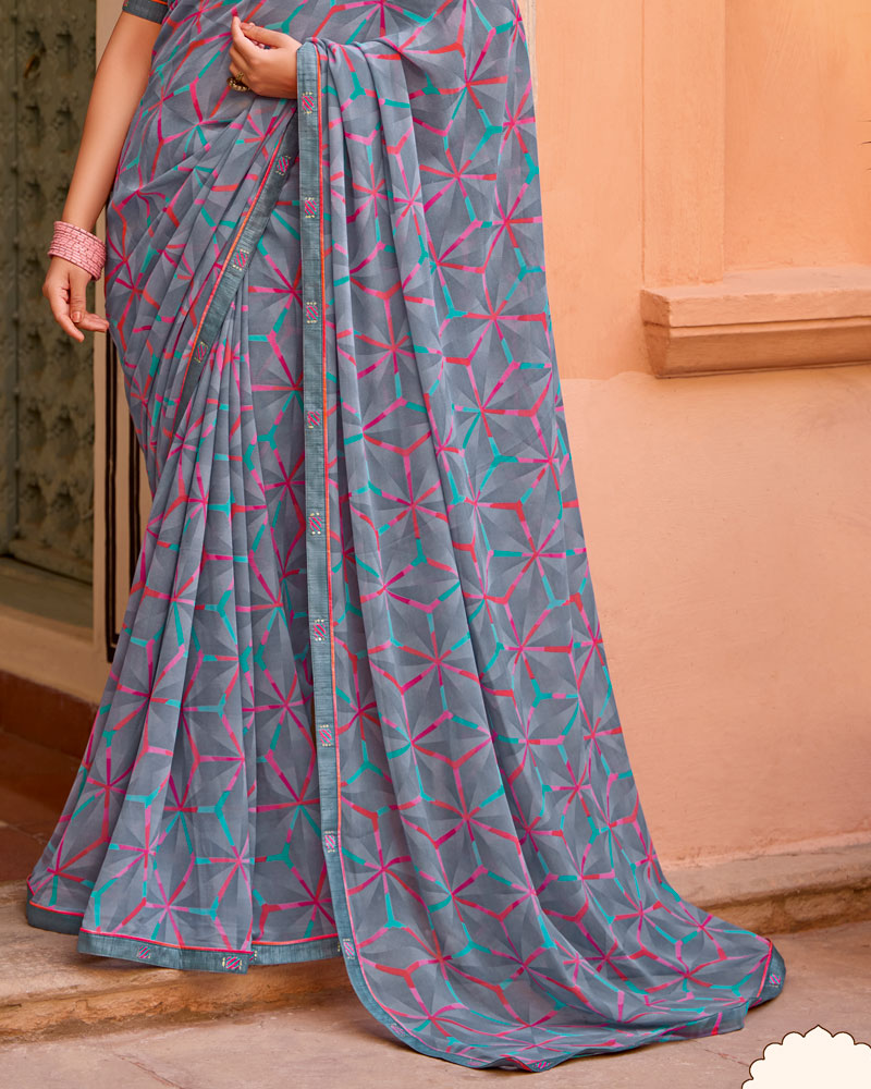 Vishal Prints Slate Grey Printed Georgette Saree With Fancy Border