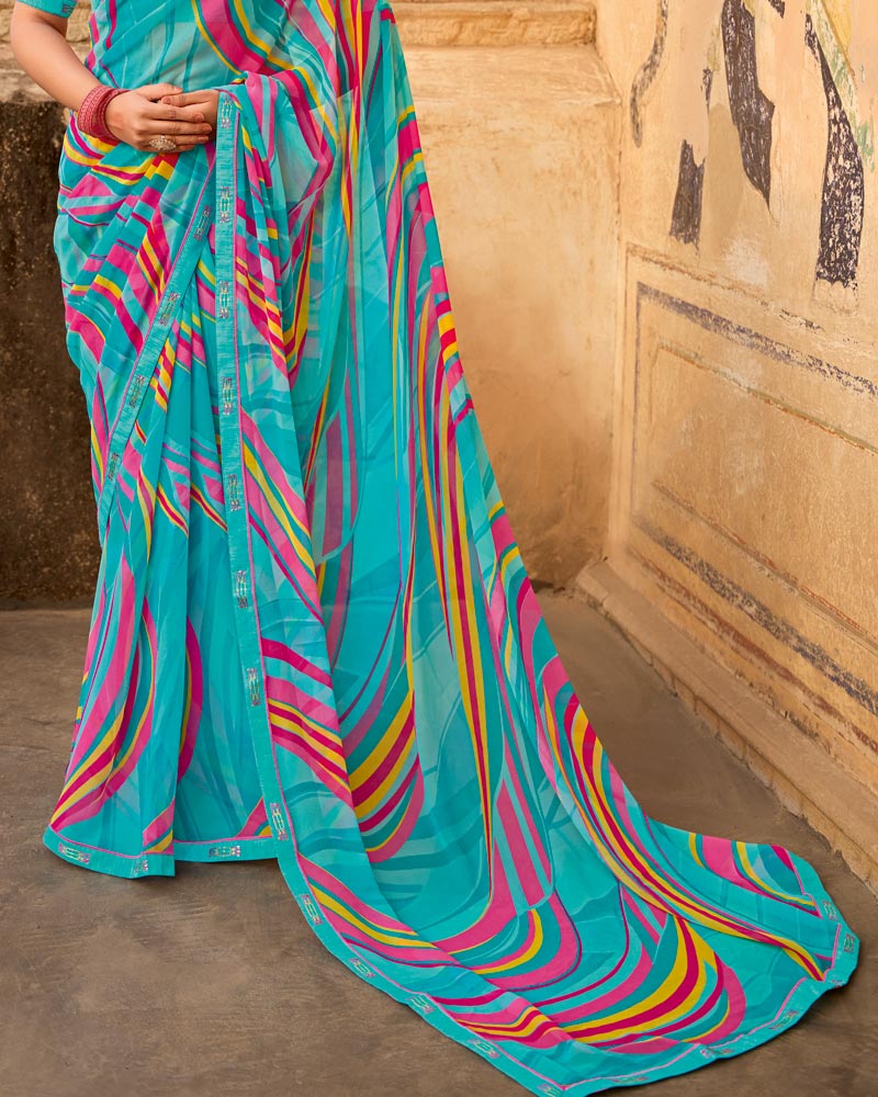 Vishal Prints Turquoise Blue Printed Georgette Saree With Fancy Border