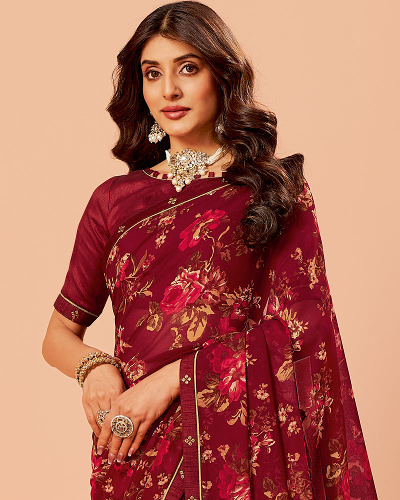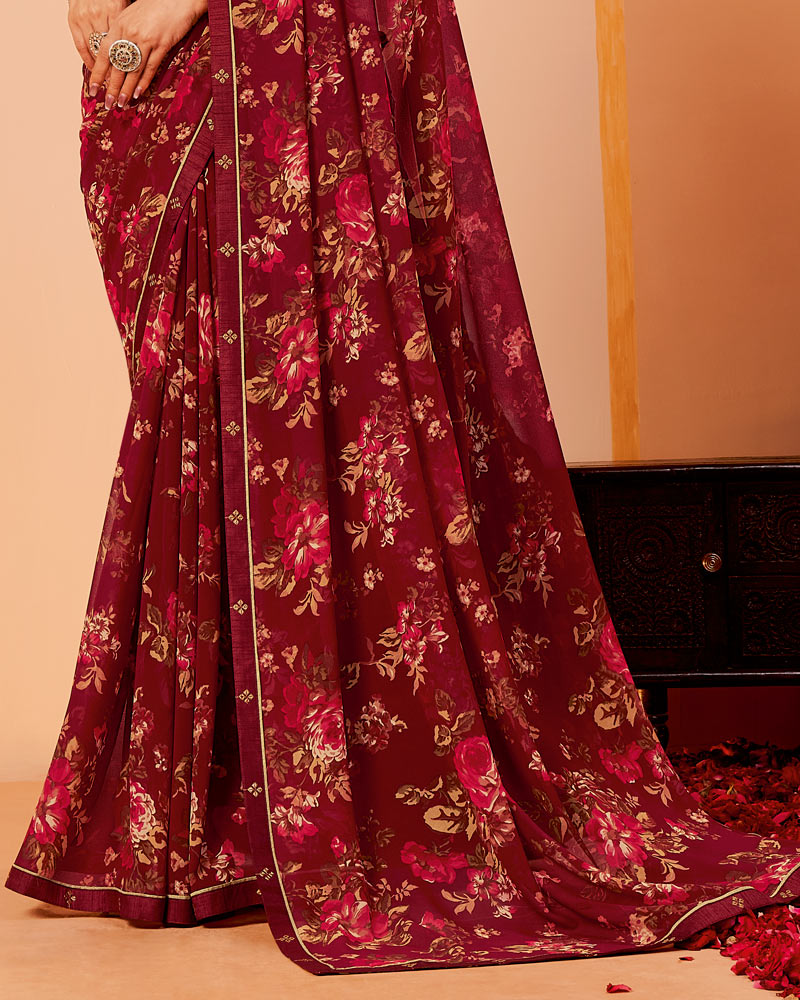 Vishal Prints Wine Red Printed Georgette Saree With Fancy Border