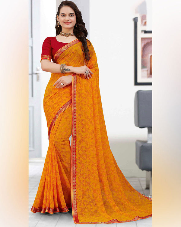 Vishal Prints Dark Orange Printed Weightless Georgette Saree With Foil Print And Zari Border