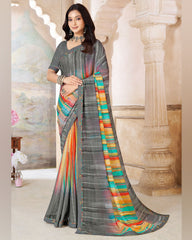 Vishal Prints Dark Grey Printed Patterned Georgette Saree With Fancy Border