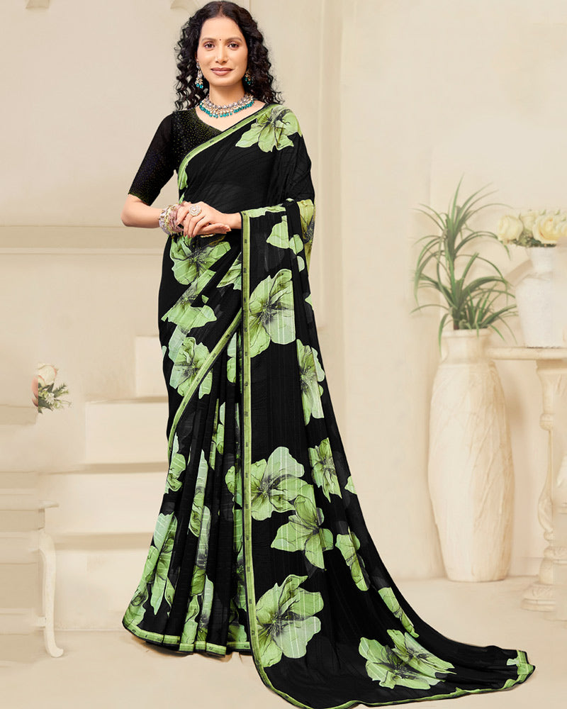 Vishal Prints Black And Light Olive Green Digital Print Patterned Georgette Saree With Fancy Border