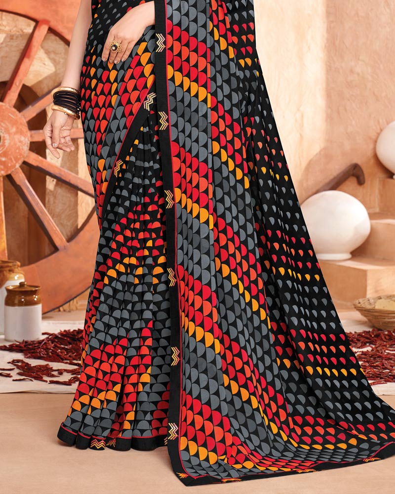 Vishal Prints Black And Red Printed Georgette Saree With Fancy Border