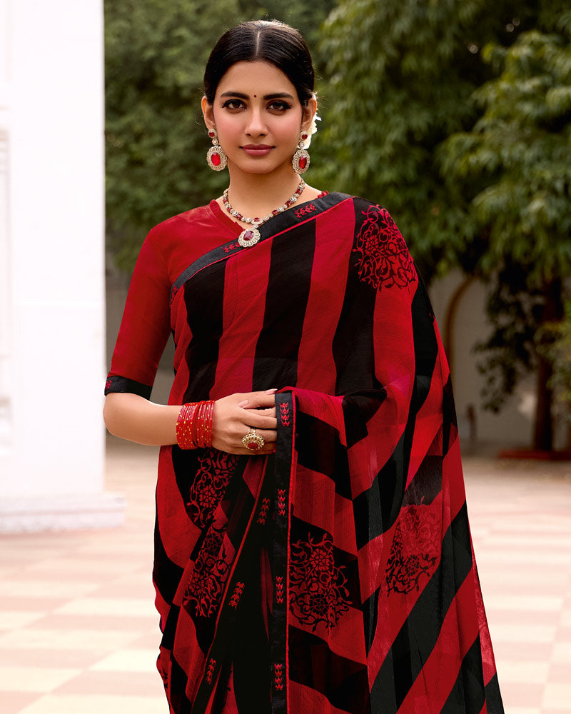 Vishal Prints Red Black Stripped Printed Chiffon Saree With Fancy Border