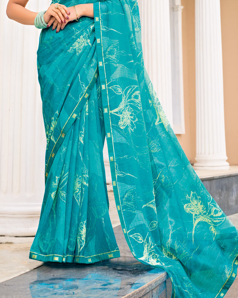 Vishal Prints Teal Blue Printed Fancy Chiffon Saree With Fancy Border