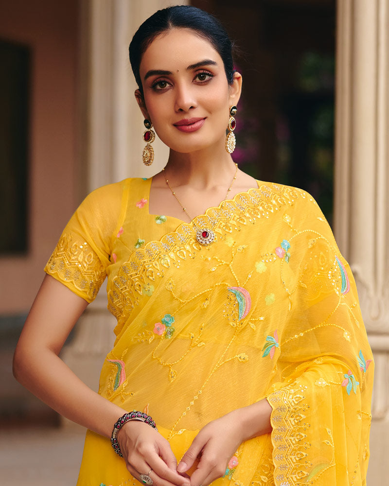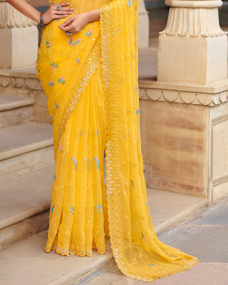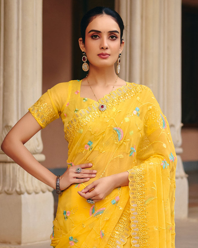Bright Yellow Designer Fancy Chiffon Saree With Embroidery-Diamond Work And Cut Work Border