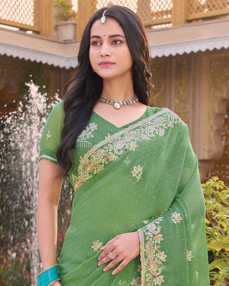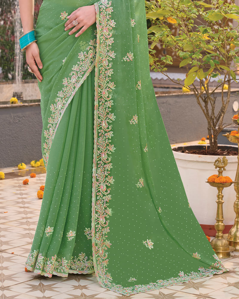 Dark Sage Green Designer Shimmer Chiffon Saree With Embroidery-Diamond Work And Cut Work Border