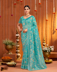 Fountain Blue Designer Gold Crush Saree With Embroidery-Diamond Work And Cut Work Border