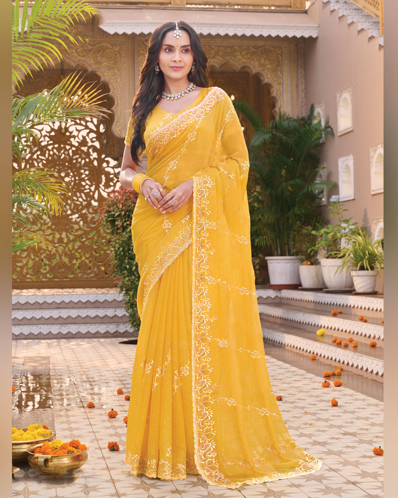 Indian Yellow Designer Shimmer Chiffon Saree With Embroidery-Diamond Work And Cut Work Border