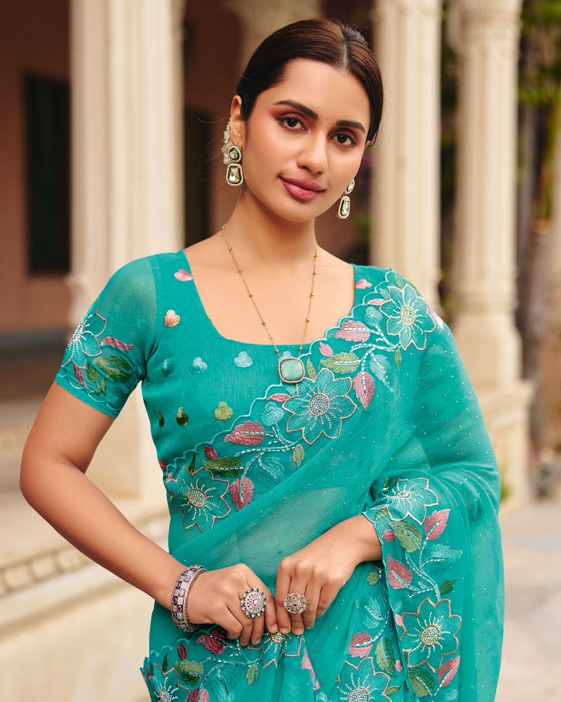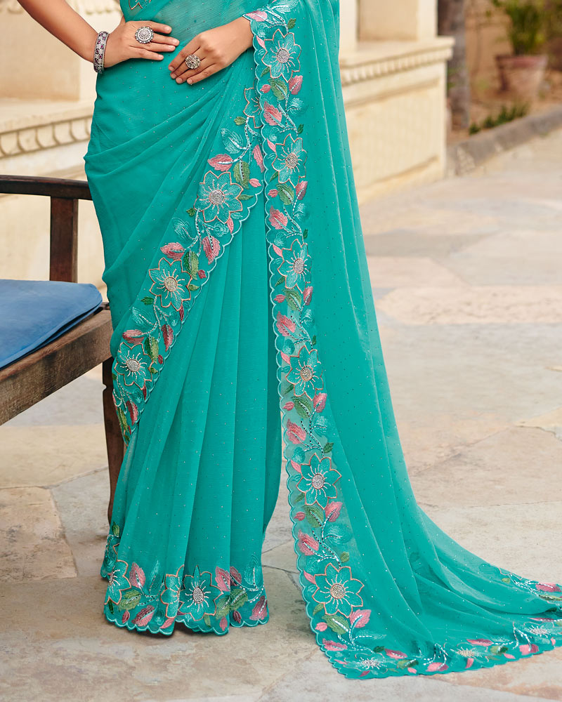 Persian Green Designer Fancy Chiffon Saree With Embroidery-Diamond Work And Cut Work Border