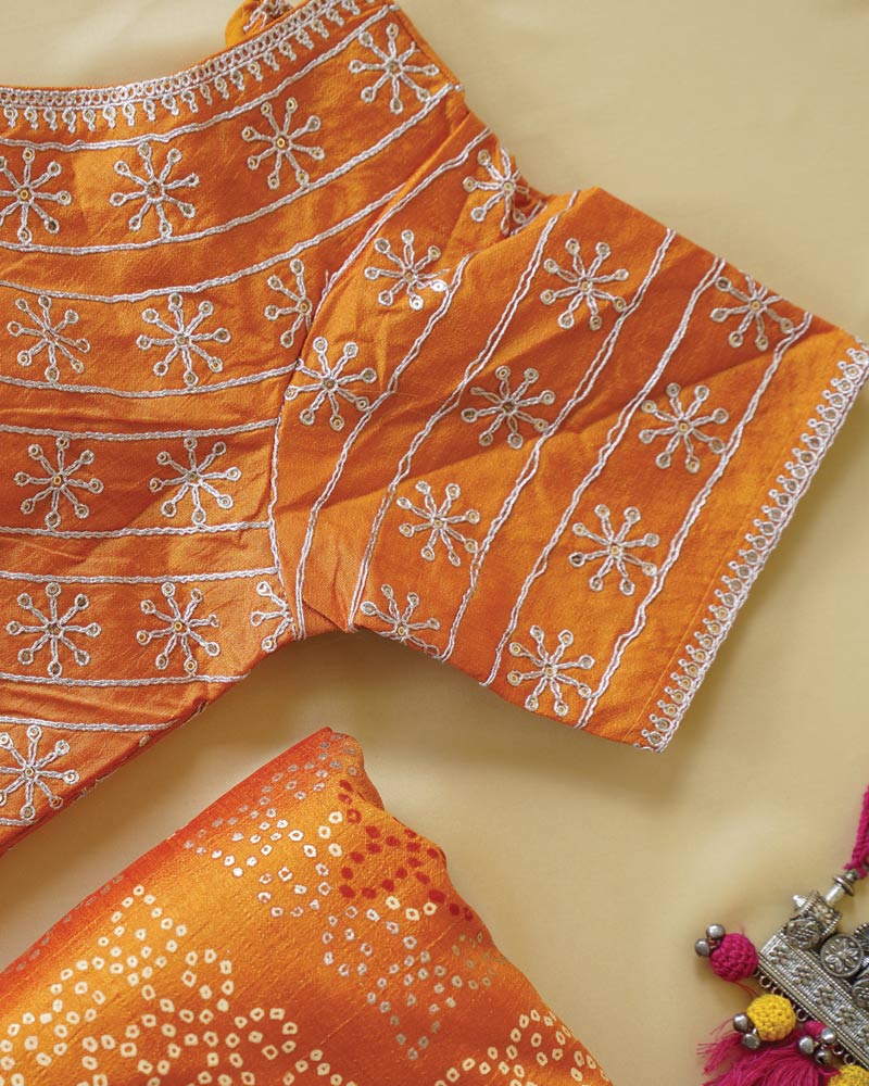 Persian Orange Designer Raw Silk Traditional Print Saree With Foil Print And Sequence Embroidery Work