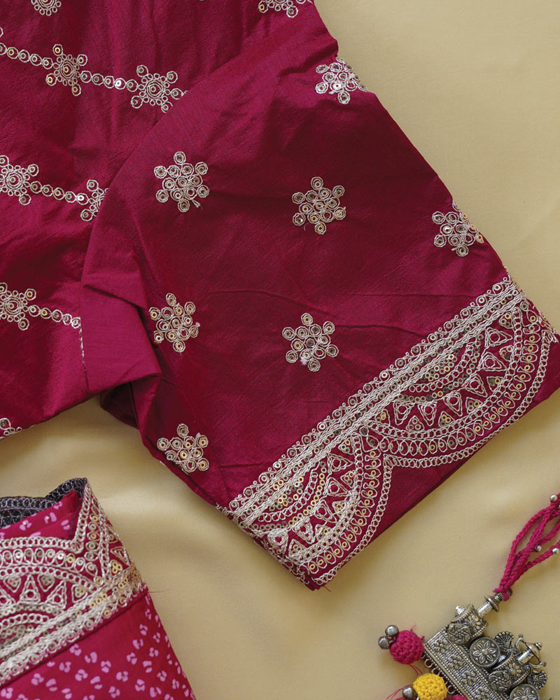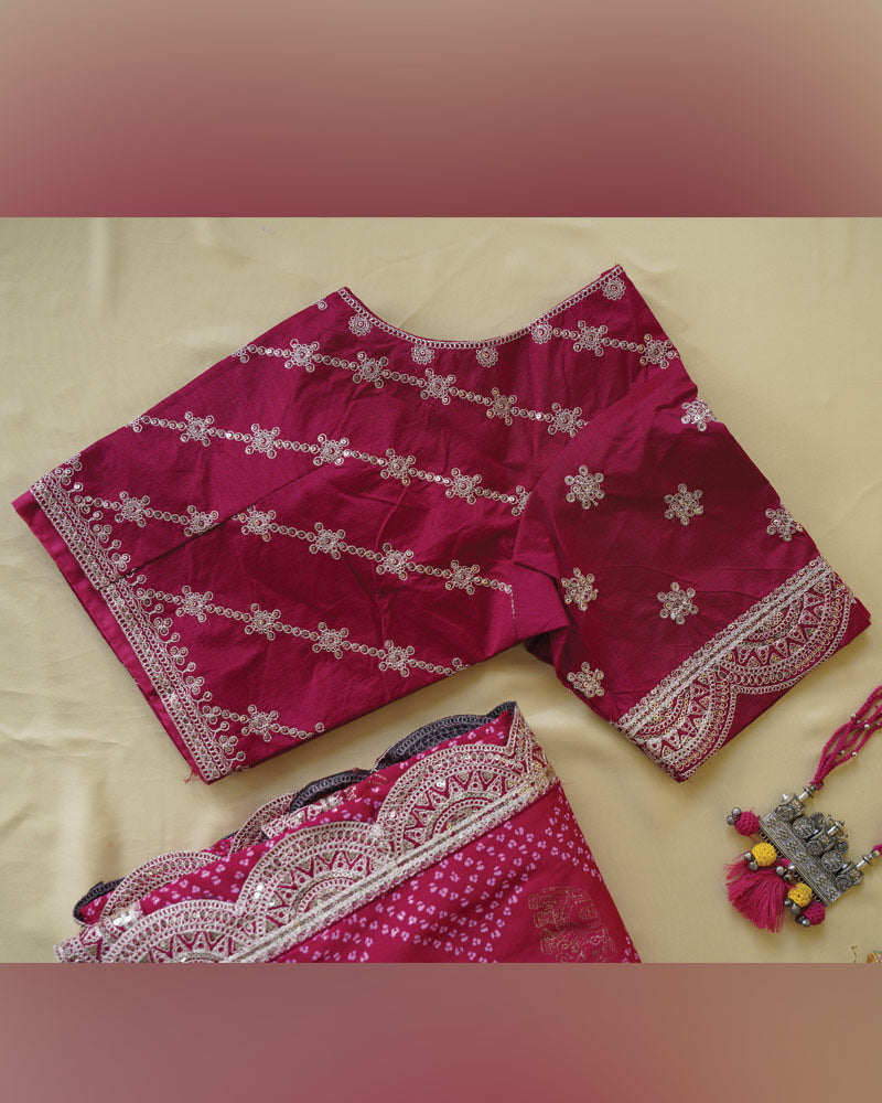 Purple Red Designer Raw Silk Traditional Print Saree With Foil Print And Sequence Embroidery Cut Work Border