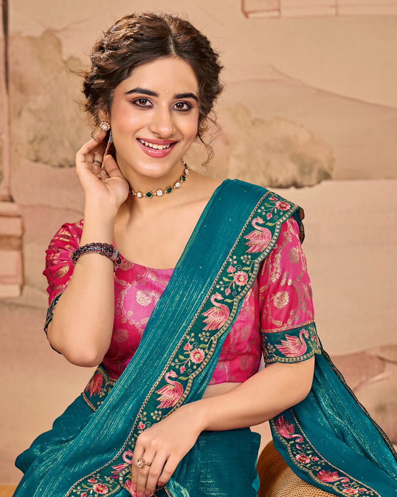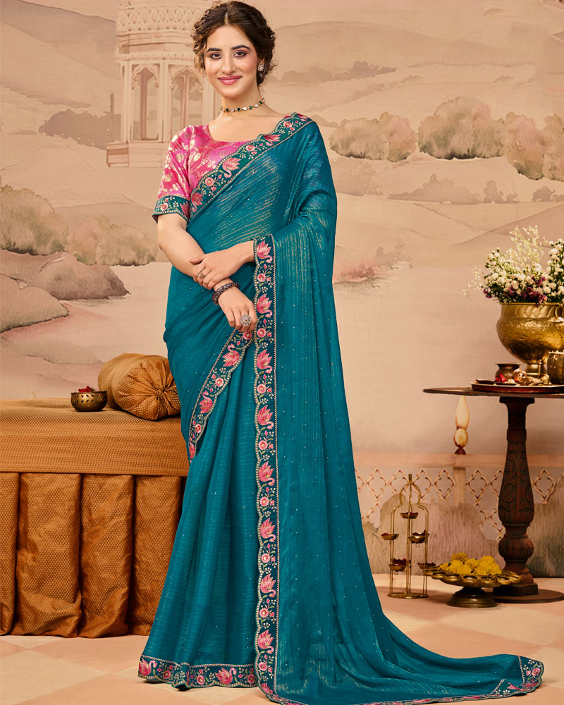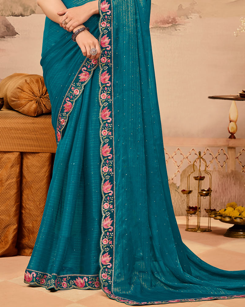 Vishal Prints Aquamarine Teal Blue Designer Fancy Chiffon Saree With Diamond Work And Cut Work Embroidery Border
