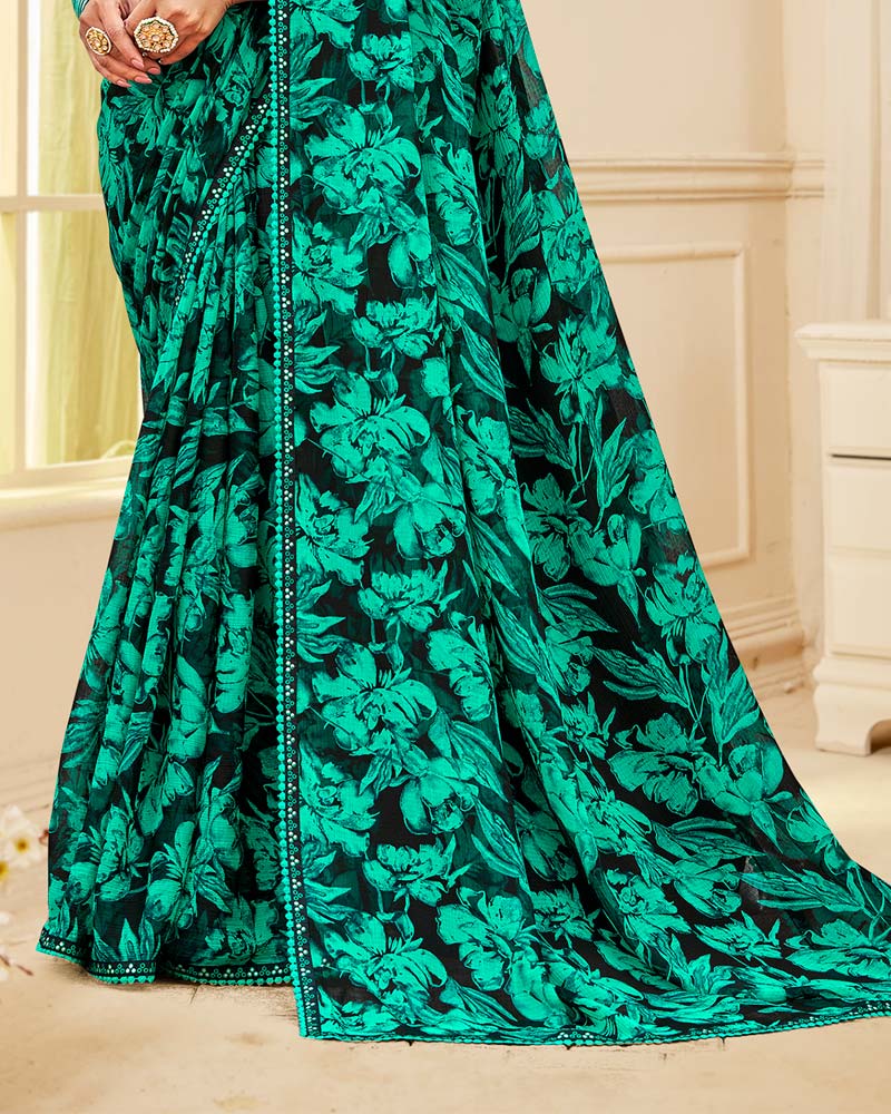 Vishal Prints Black And Aqua Green Printed Chiffon Saree With Fancy Border