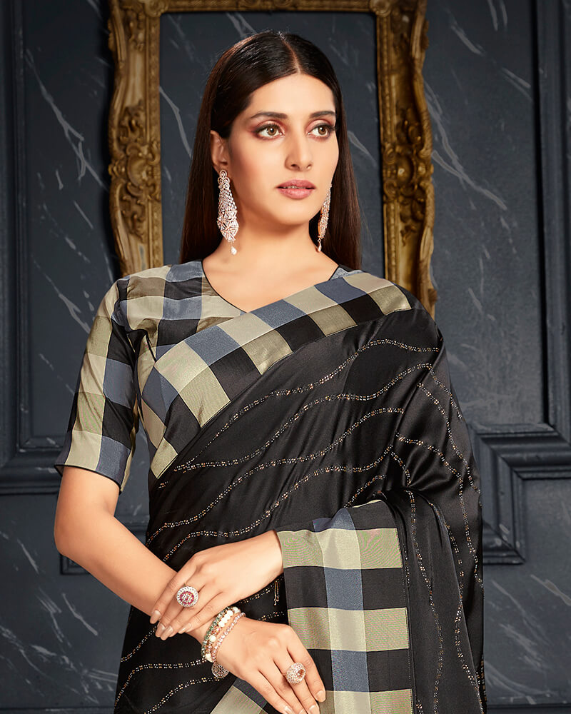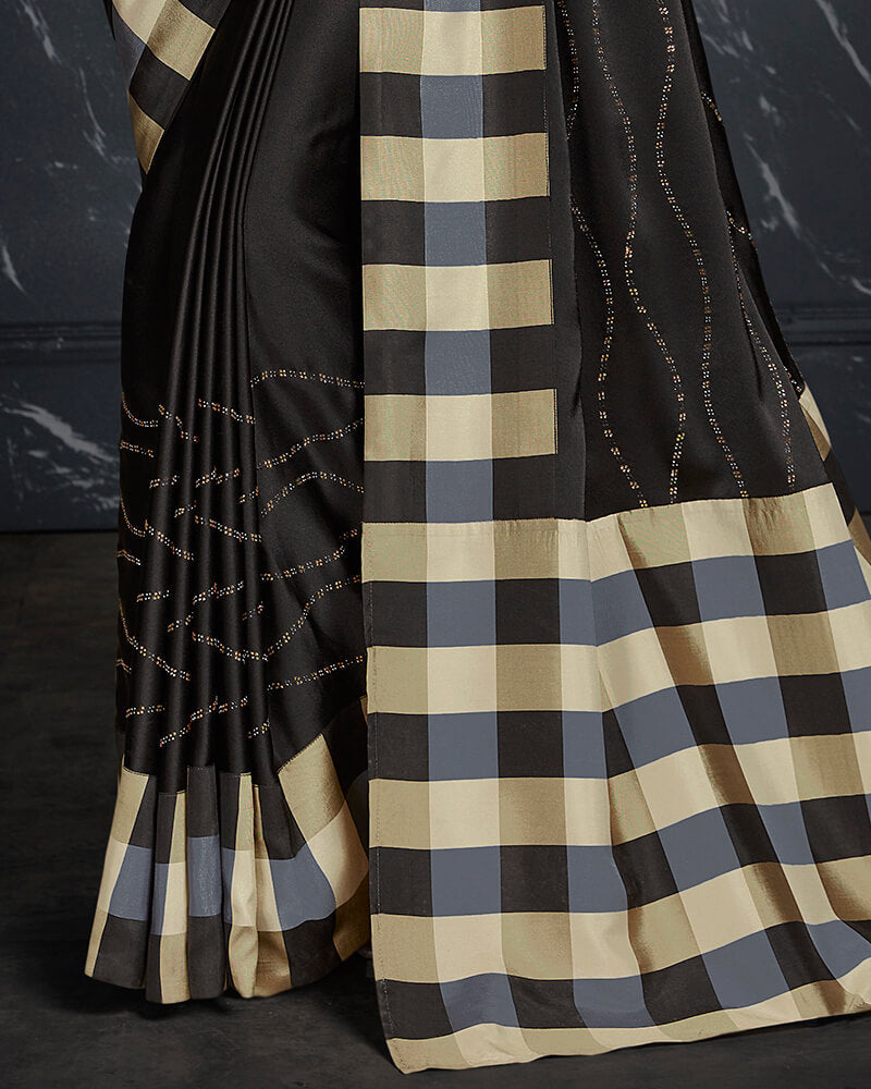 Vishal Prints Black And Beige Satin Saree With Stone Work