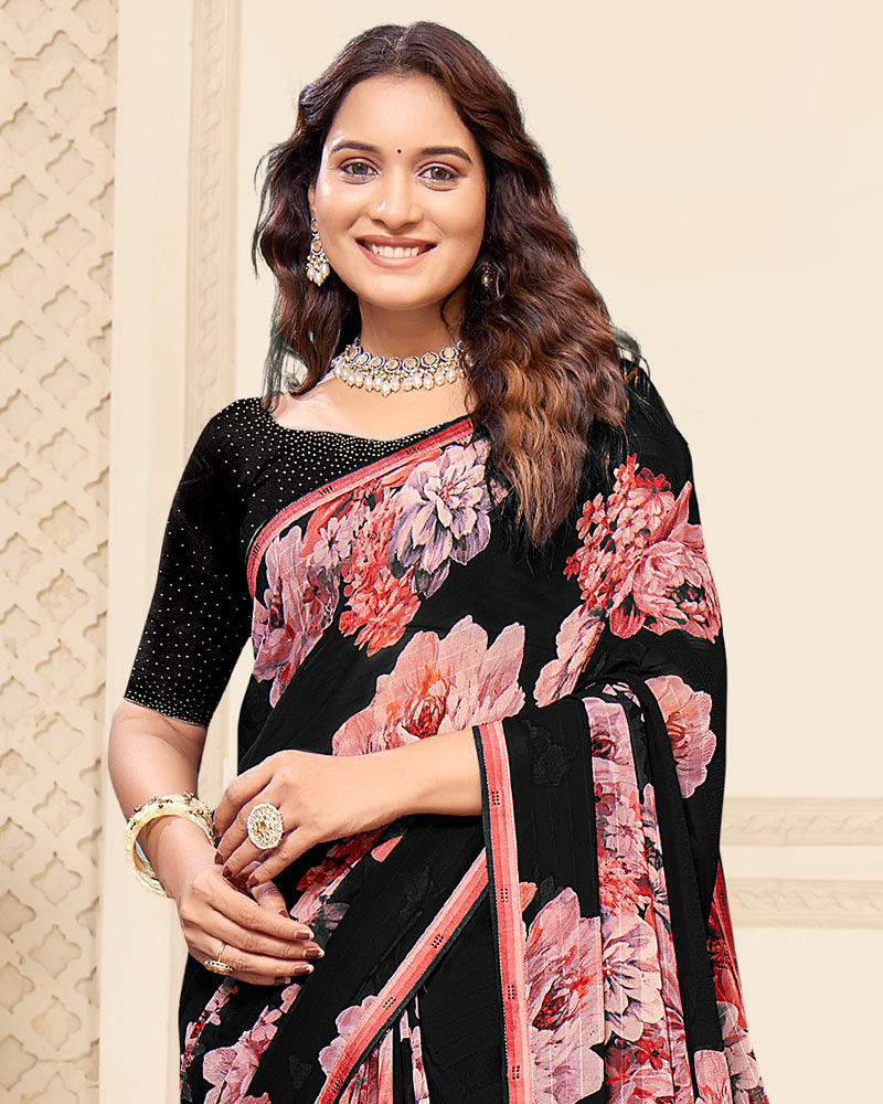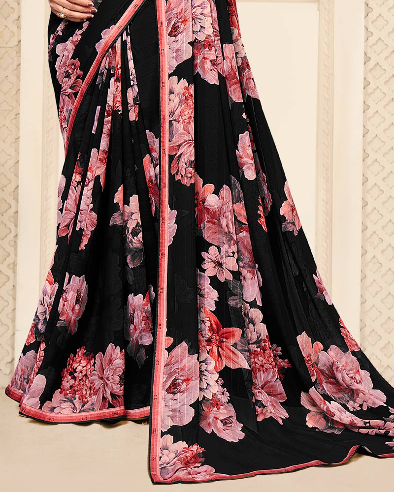 Vishal Prints Black And Faded Pink Digital Print Patterned Georgette Saree With Fancy Border