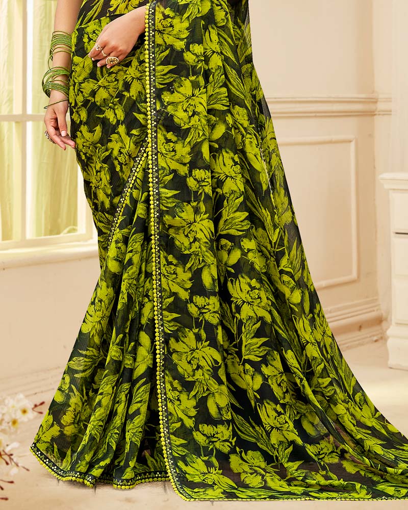Vishal Prints Black And Vibrant Yellow Printed Chiffon Saree With Fancy Border