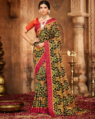 Vishal Prints Black Printed Silk Brasso Saree With Weaved Satin Patta And Diamond Work