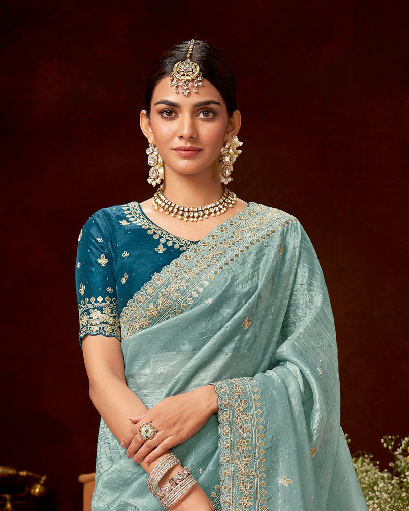 Vishal Prints Bluish Grey Crushed Zari Chiffon Saree With Embroidery-Foil Work And Cut Work Swarovski Border