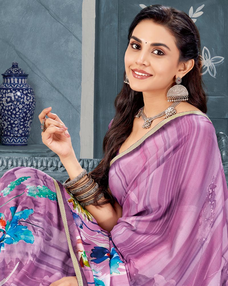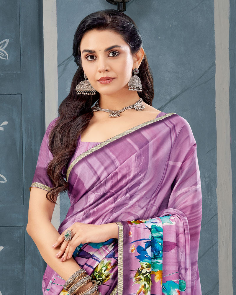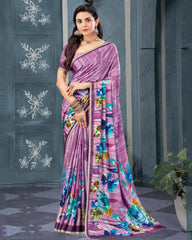 Vishal Prints Bouquet Purple Digital Print Criva Crepe Saree With Weaved Viscose Border