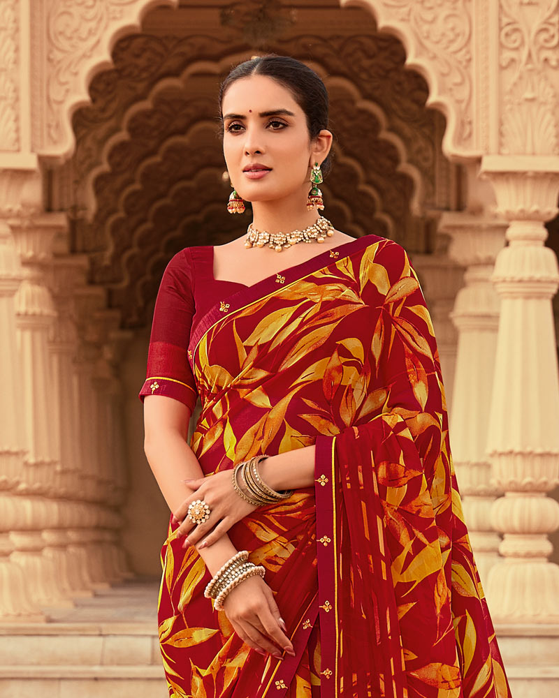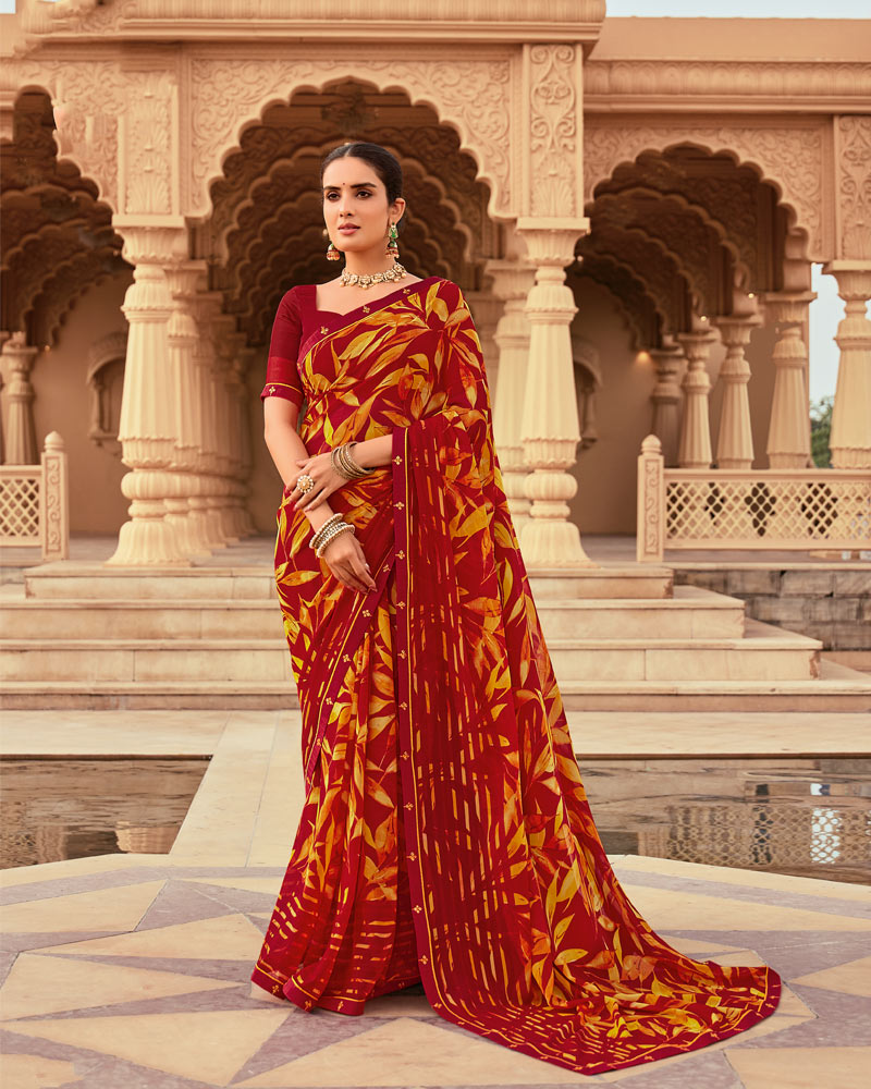 Vishal Prints Brick Red And Cadmium Orange Printed Georgette Saree With Fancy Border
