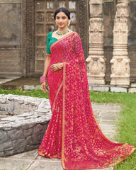 Vishal Prints Bright Maroon Printed Chiffon-Brasso Saree With Zari Border