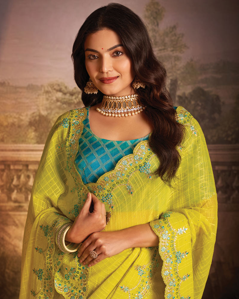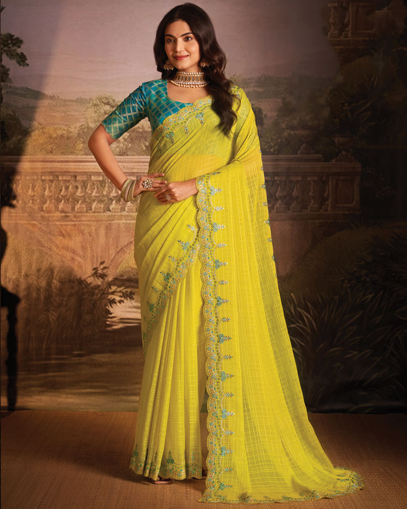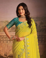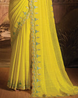Vishal Prints Bright Yellow Designer Zari-Chiffon Saree With Diamond Work And Cut Work Embroidery Border