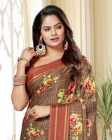 Vishal Prints Brown Satin Saree With Foil Print And Tassel