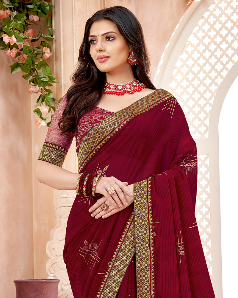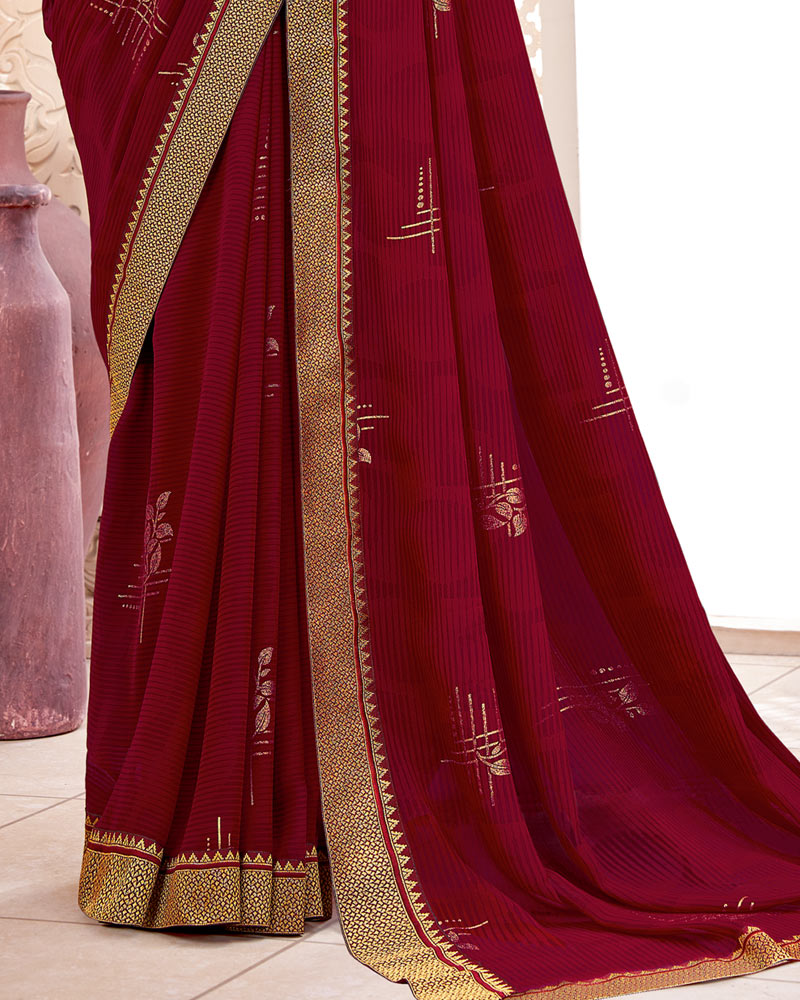 Vishal Prints Burgundy Chiffon Saree With Foil Print And Zari Border