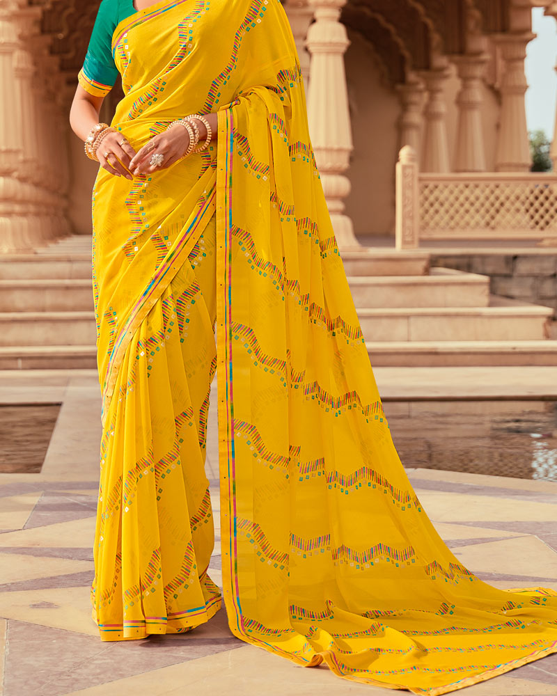 Vishal Prints Burnt Yellow Printed Georgette Saree With Foil Print And Fancy Border
