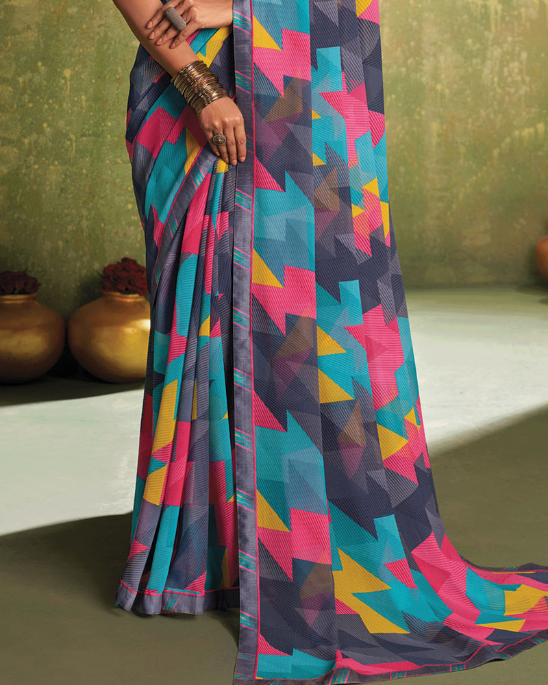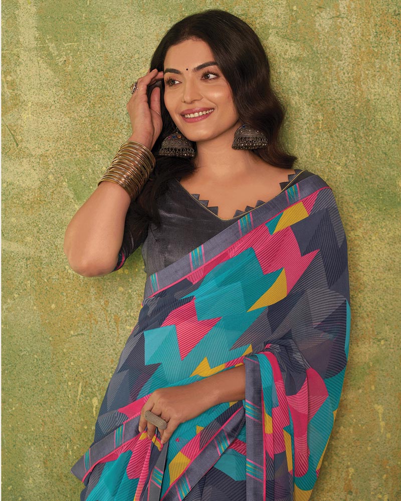 Vishal Prints Carbon Grey And Fountain Blue Printed Georgette Saree With Fancy Border