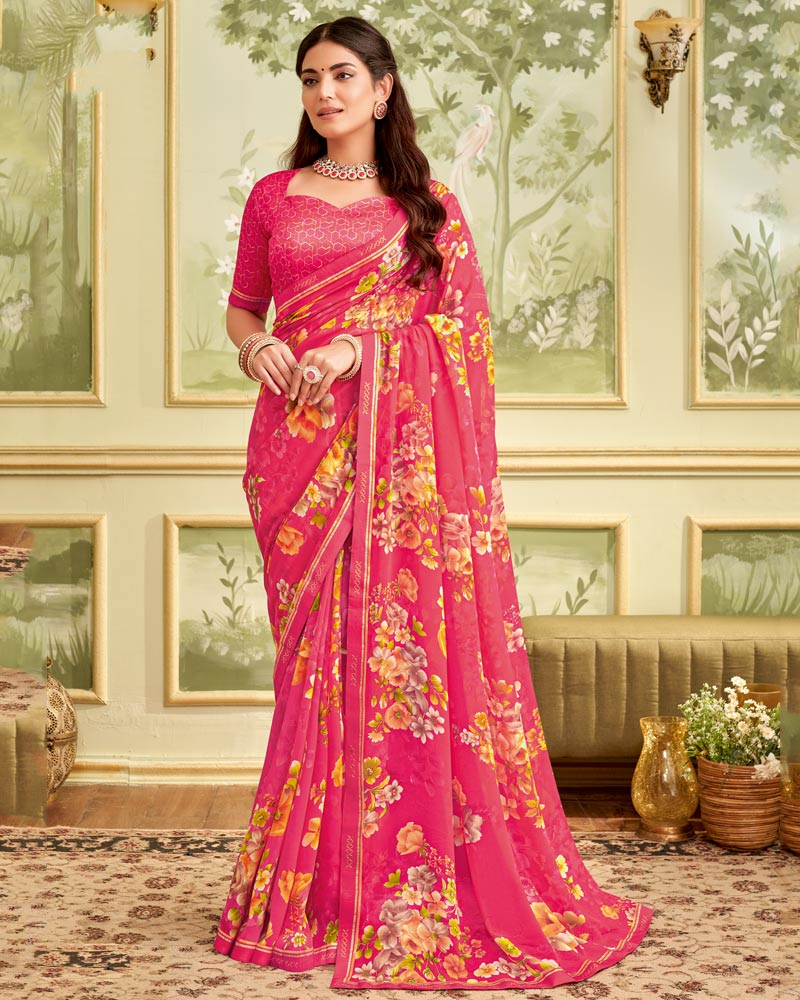 Vishal Prints Carmine Pink Printed Georgette Saree With Fancy Border