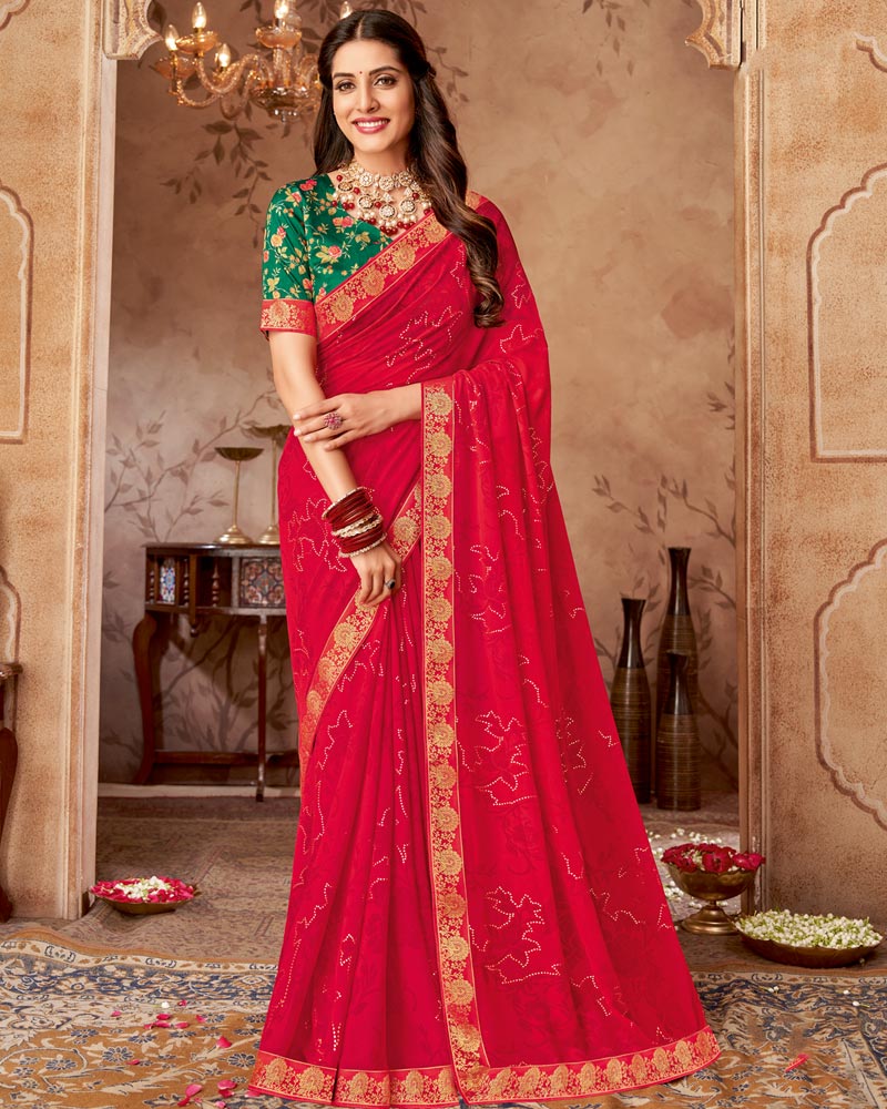Vishal Prints Carmine Red Printed Georgette Saree With Foil Print And Zari Border