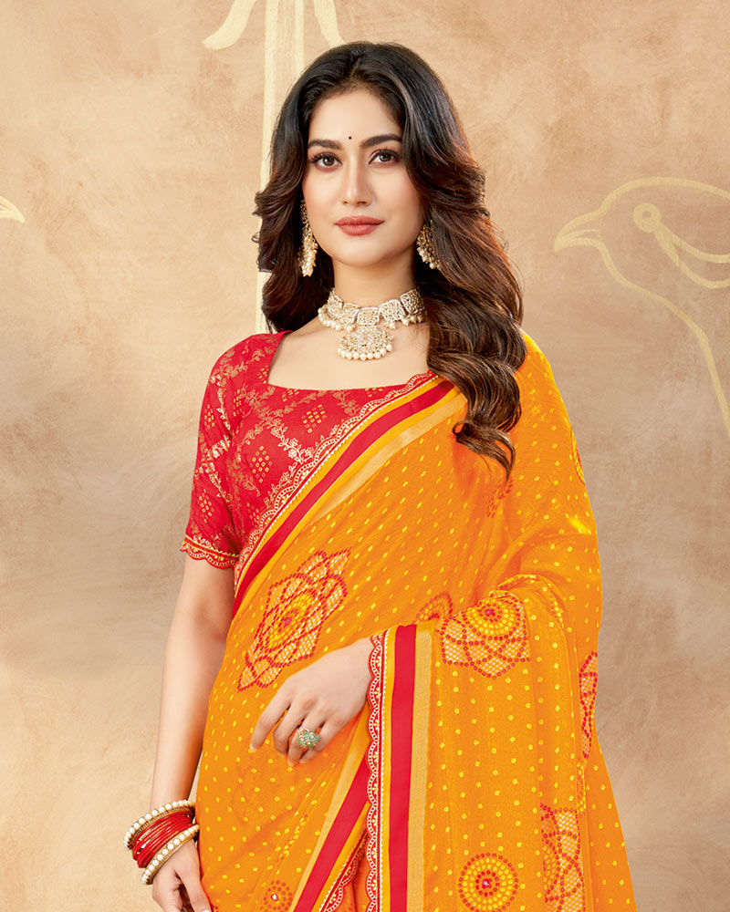 Vishal Prints Carrot Orange Printed Chiffon Traditional Print Saree With Foil Print And Weaved Satin Patta Cut Work Border