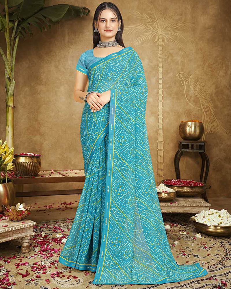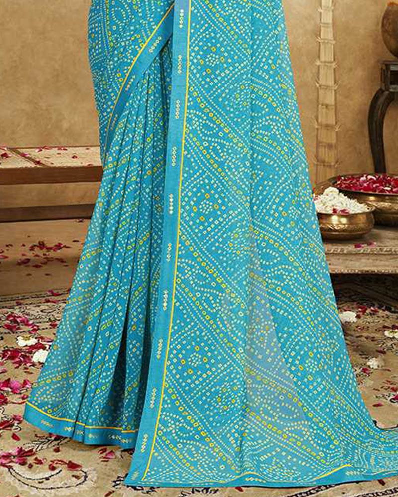 Vishal Prints Cerulean Blue Printed Georgette Bandhani Print Saree With Fancy Border
