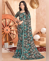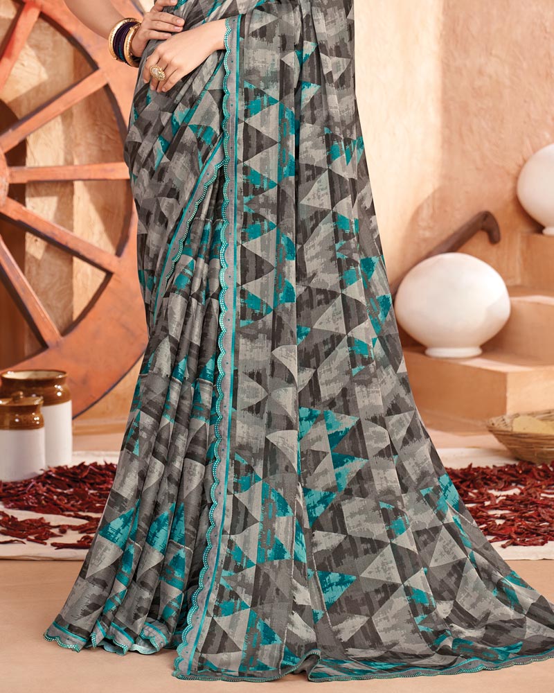 Vishal Prints Charcoal And Warm Grey Printed Georgette Saree With Cut Work Border